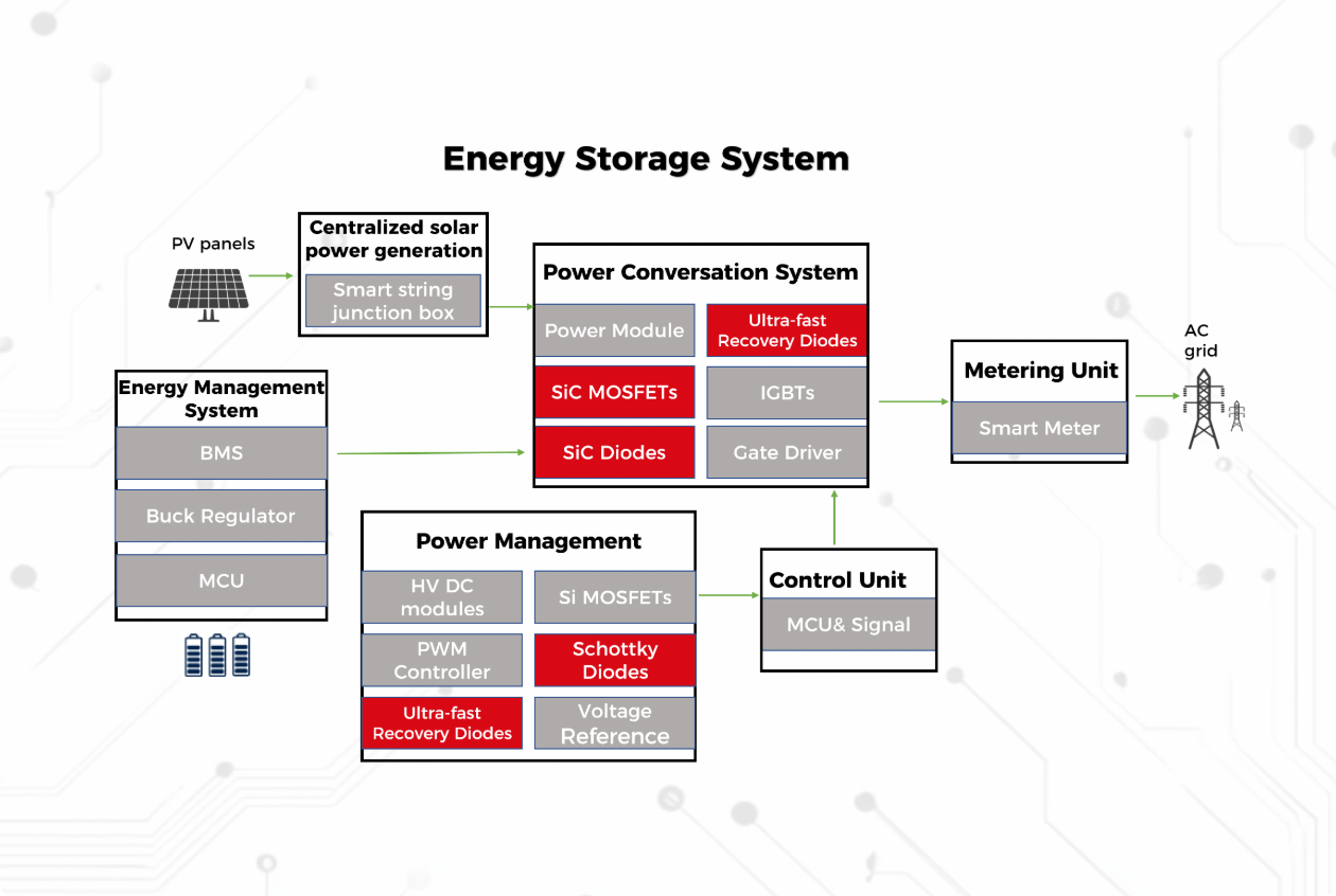 The ultra-fast recovery diode can be used in PCS system. The ultra-fast recovery diode of SMC has a lower forward conduction voltage drop VF, which can reduce the conduction loss; At the same time, it also has smaller reverse recovery time Trr and lower reverse recovery peak current Irrm, so it has smaller reverse recovery loss, so that the system can have higher system conversion efficiency; If the silicon carbide diode of SMC is used, the reverse recovery loss can be minimized, and the temperature of the switchers(IGBTs or MOSFETs) in the system circuit can be significantly improved. Customers can choose the ultra-fast recovery diode or silicon carbide diode according to their actual needs.