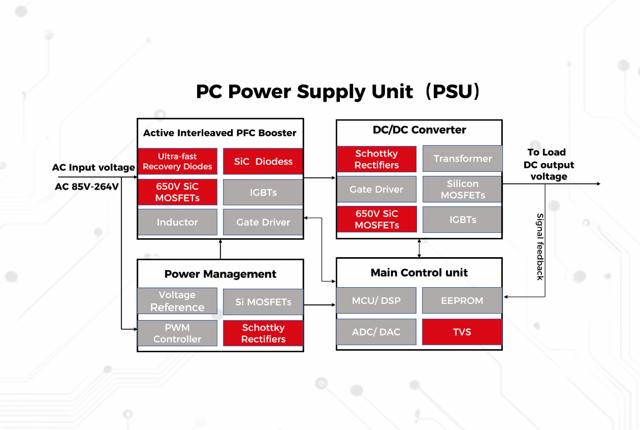 - High-voltage DC feeds the main switching converter. Modern high-efficiency PSUs predominantly use an LLC Resonant Half-Bridge/Full-Bridge Converter: