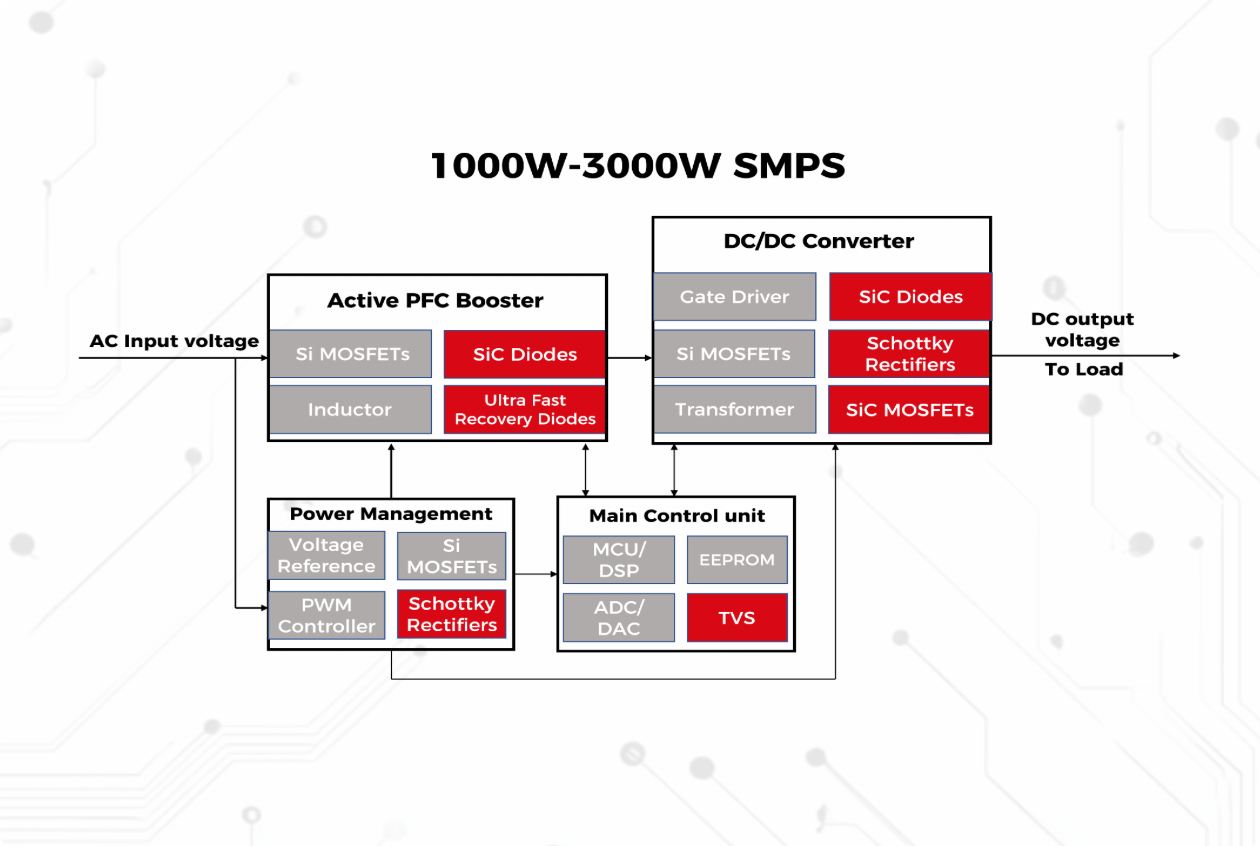 With the rapid development of industrial automation, data centers, and renewable energy sectors, 1000W-3000W medium-to-high-power switched-mode power supplies (SMPS) have become mainstream due to their high efficiency, power density, and stability. These power supplies typically adopt a two-stage design: a front-stage Power Factor Correction (PFC) circuit followed by a DC/DC converter. Working synergistically, they achieve wide input voltage range, low harmonic distortion, and high-efficiency output. This article systematically analyzes their operating principles, typical topological architectures, and explores industry development trends.